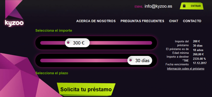 Para realizar la solicitud de mini créditos rápidos online en Kyzoo solamente tienes que entrar en su página web de solicitudes online aquí y seleccionar la cantidad a solicitar y el plazo máximo de devolución del dinero. En esta pantalla dispones de toda la información del préstamo a solicitar, como son los requisitos necesarios para disponer del dinero o del proceso de devolución y renovación del mismo.