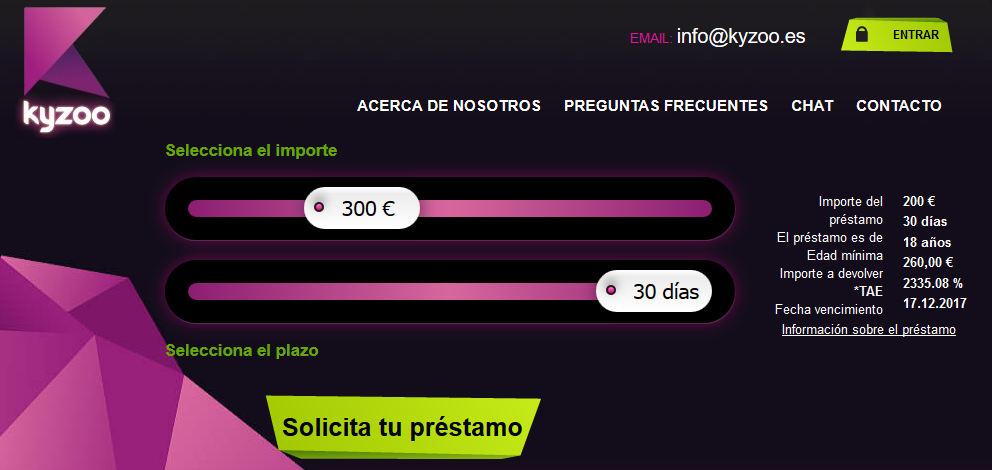 Para realizar la solicitud de mini créditos rápidos online en Kyzoo solamente tienes que entrar en su página web de solicitudes online aquí y seleccionar la cantidad a solicitar y el plazo máximo de devolución del dinero. En esta pantalla dispones de toda la información del préstamo a solicitar, como son los requisitos necesarios para disponer del dinero o del proceso de devolución y renovación del mismo.